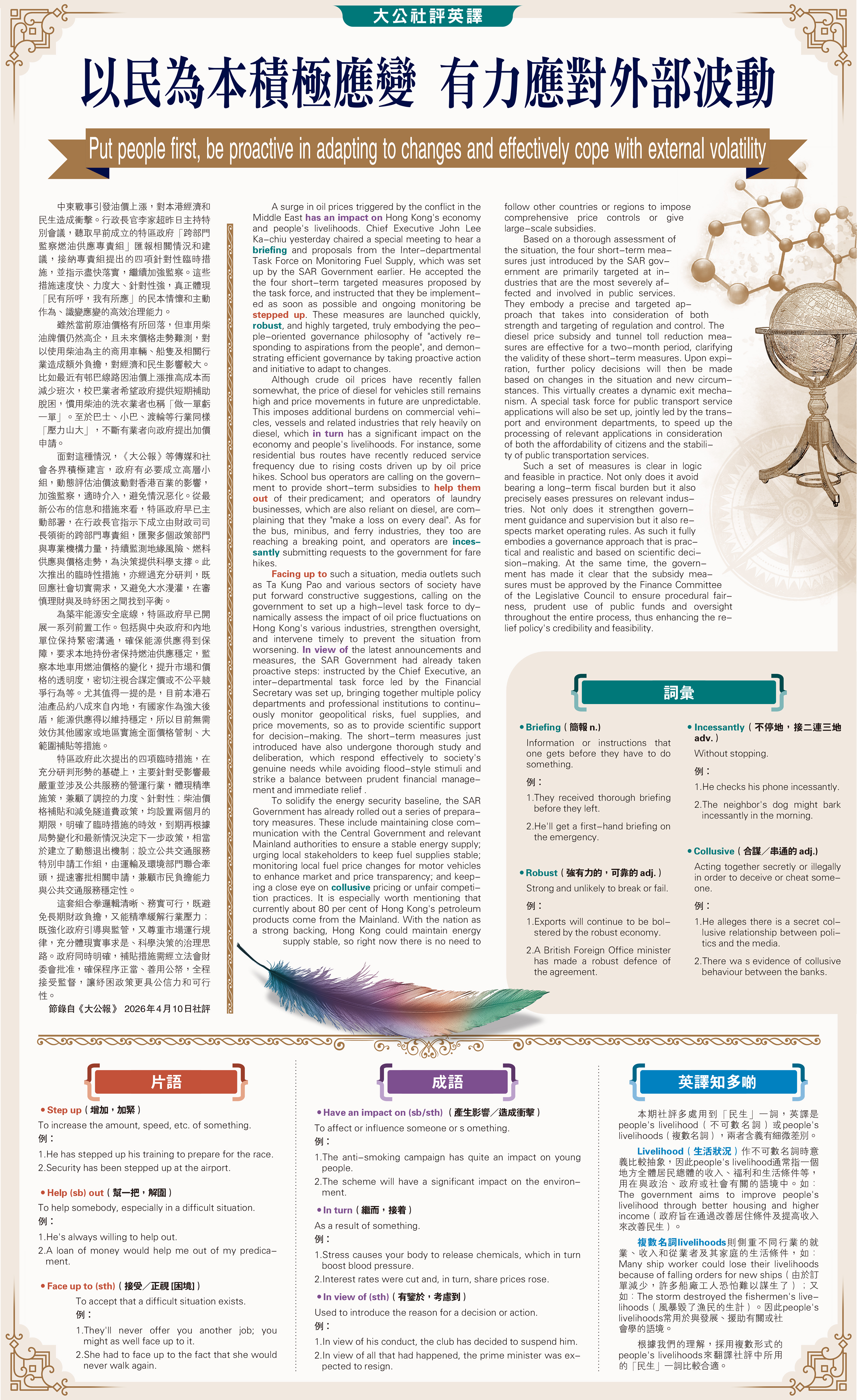 A surge in oil prices triggered by the conflict in the Middle East has an impact on Hong Kong's economy and people's livelihoods. Chief Executive John Lee Ka-chiu yesterday chaired a special meeting to hear a briefing and proposals from the Inter-departmental Task Force on Monitoring Fuel Supply, which was set up by the SAR Government earlier. He accepted the the four short-term targeted measures proposed by the task force, and instructed that they be implemented as soon as possible and ongoing monitoring be stepped up. These measures are launched quickly, robust, and highly targeted, truly embodying the people-oriented governance philosophy of "actively responding to aspirations from the people", and demonstrating efficient governance by taking proactive action and initiative to adapt to changes.