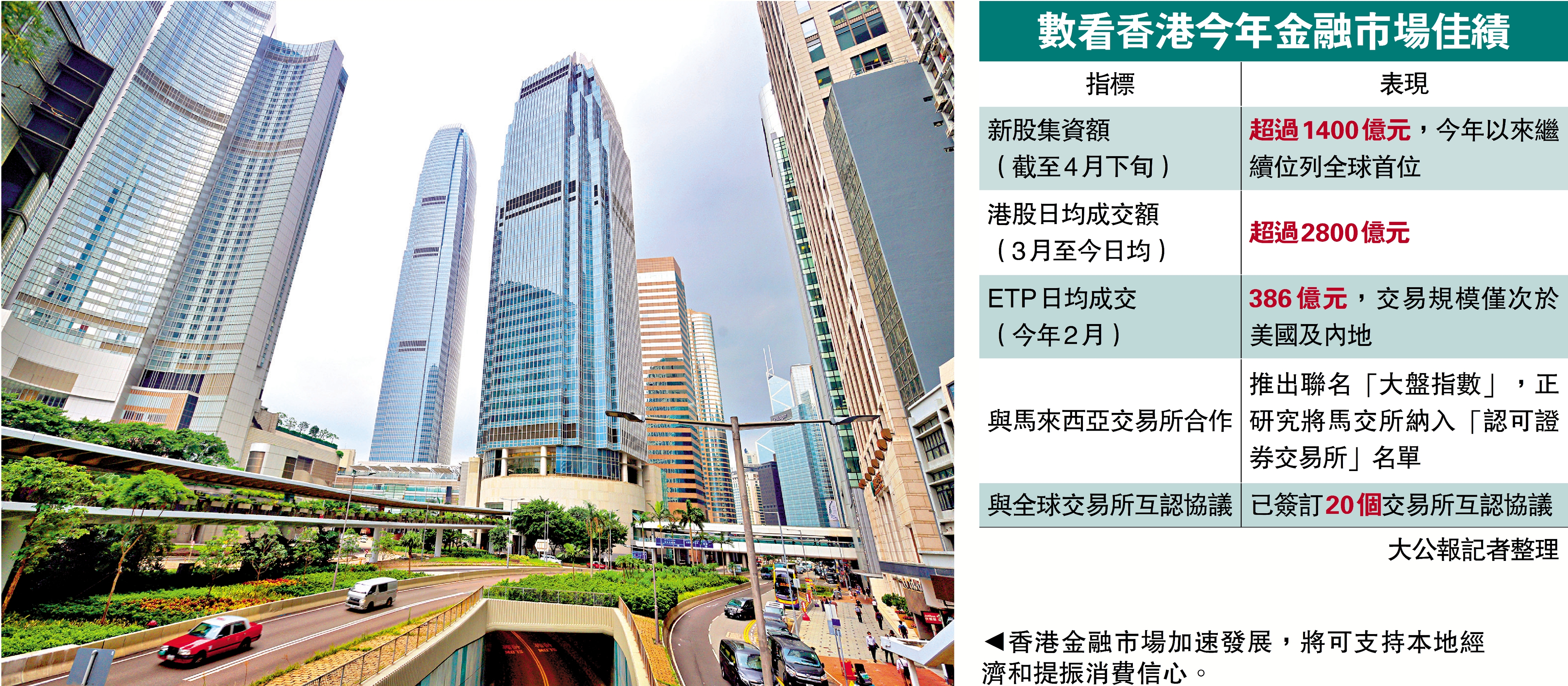 財政司司長陳茂波昨日在網誌中表示,本港新股市場延續強勢,今年以來集資額已超過1400億元,繼續位列全球首位;3月份至今港股日均成交額突破2800億元。他強調,即使外圍地緣政治風雲變幻,在特區政府與業界共同努力下,香港金融市場發展勢不可擋。他指出,香港穩定安全、資金與人才匯聚、資本與數據自由流動、法律體系廣受信賴等優勢,對全球投資者吸引力正進一步提升。/大公報記者 邵淑芬