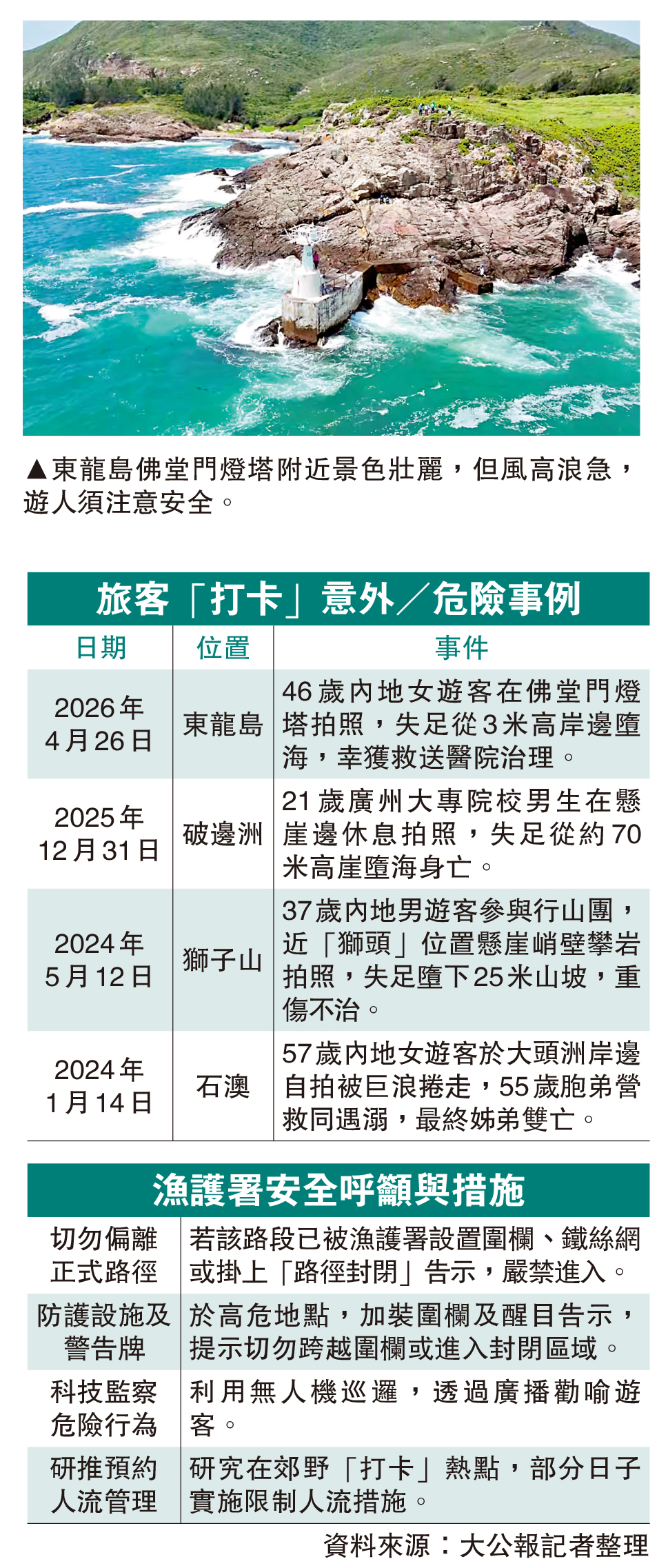 西貢遊客「打卡」墮海意外時有發生。2025年12月31日早上10時14分,來自廣州的21歲姓黃男子在西貢破邊洲行山,其間行到懸崖位置拍照疑失足墮70米下海面,同行同學報警求助,黃男送院搶救後證實不治。漁護署曾經多次發布行山安全指引,提醒遊人切勿跨越圍欄冒險拍照。