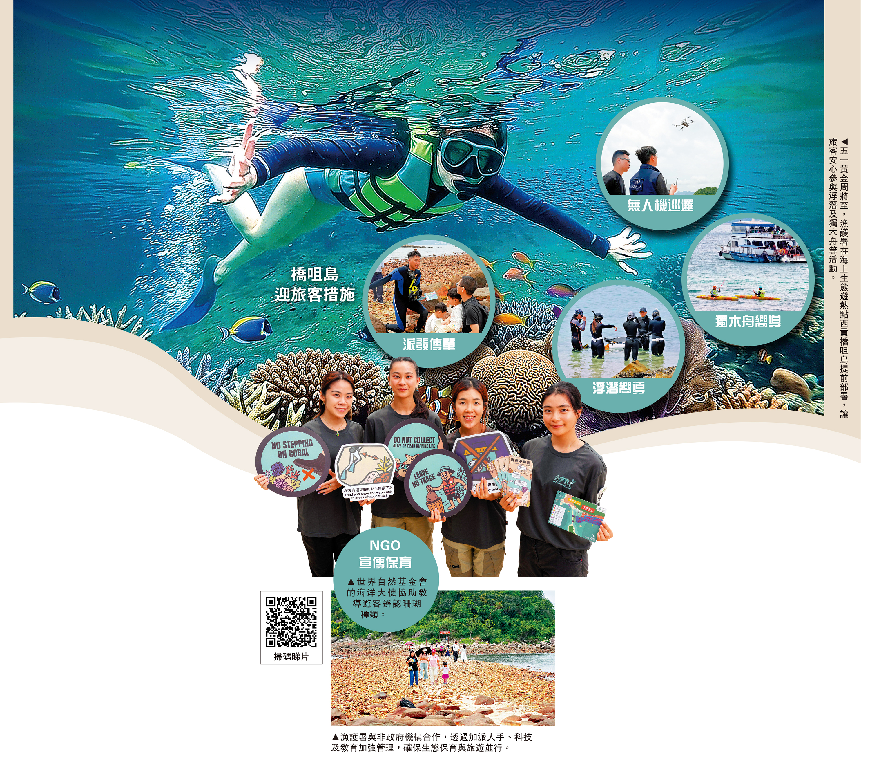 西貢的橋咀島水清如鏡、珊瑚品種多,近年成為遊客浮潛及划獨木舟的熱門勝地,為讓遊客玩得安全及更有意義,特區政府提早部署,由漁農自然護理署聯同世界自然基金會(WWF)香港分會,將在黃金周期間增派人員及無人機在島上加強巡邏,向遊客宣傳海洋保育,並提醒浮潛等參與水上活動人士遵循珊瑚友善路線上水、落水。
