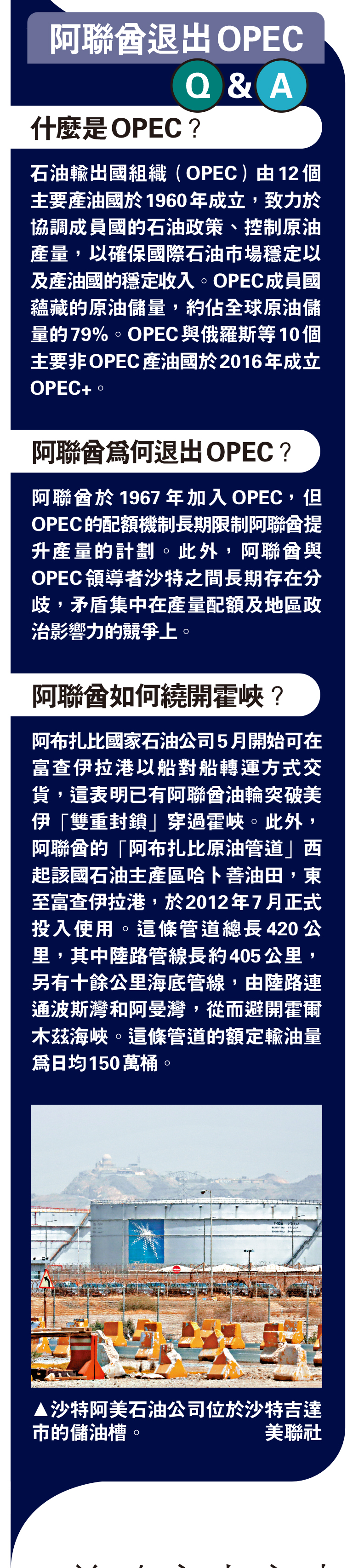 阿聯酋於1967年加入OPEC,但OPEC的配額機制長期限制阿聯酋提升產量的計劃。此外,阿聯酋與OPEC領導者沙特之間長期存在分歧,矛盾集中在產量配額及地區政治影響力的競爭上。