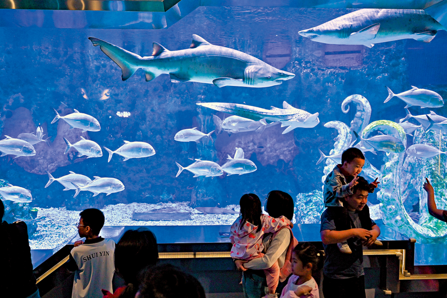 四月二十三日晚,遊客在廣州海洋館觀賞海洋動物。
