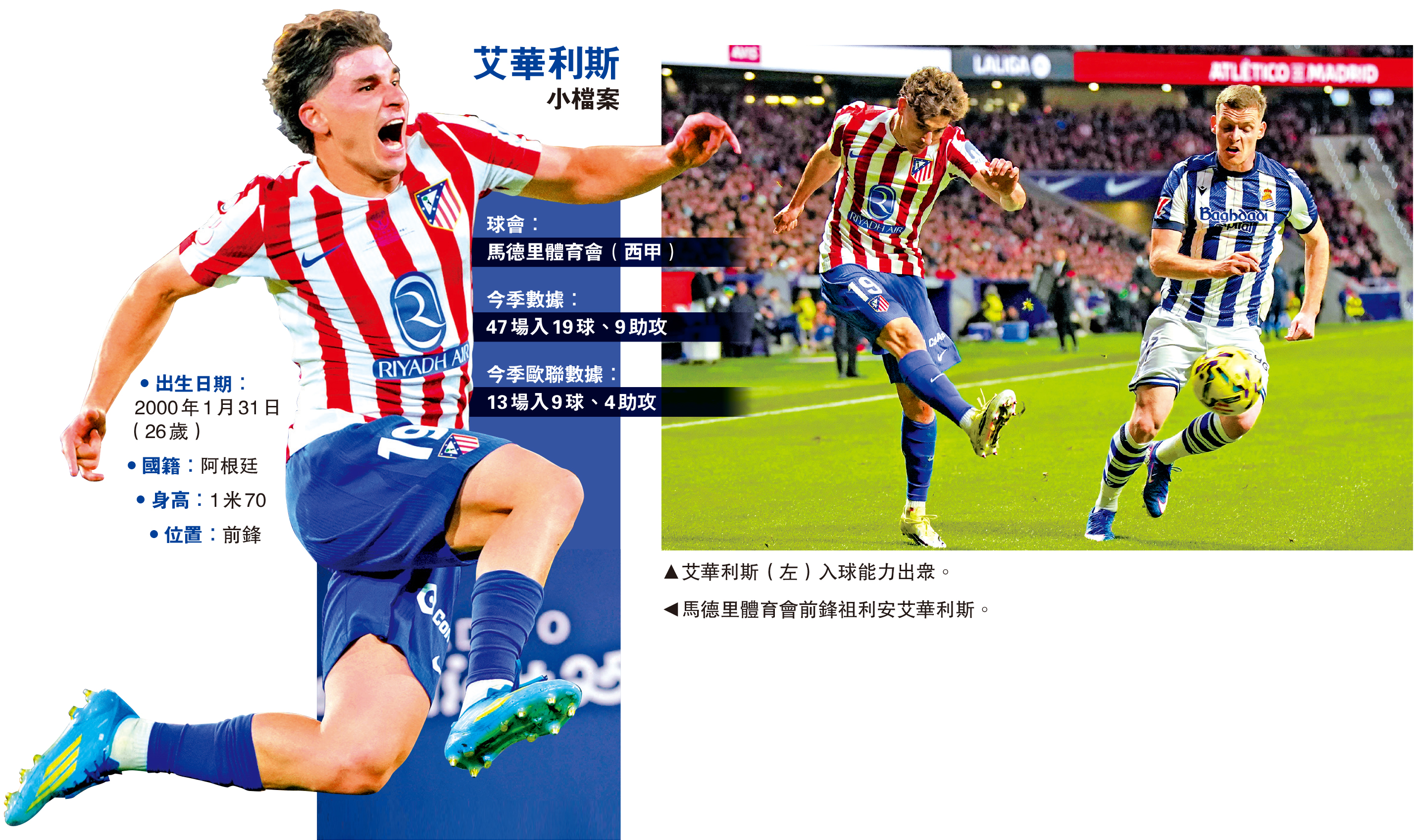 阿根廷國腳前鋒祖利安艾華利斯離開曼城後,近兩季在西甲馬德里體育會都有獨當一面的表現,上季總入球創個人職業生涯單季新高,而今季就在歐聯有亮麗成績,暫時射入9球成為馬體會隊史於單屆歐聯入球最多的球員;近日盛傳外號「蜘蛛仔」的艾華利斯已成為「兵工廠」阿仙奴的夏天收購目標,但在改投「準新東家」前,他就要先在歐聯4強首回合「策馬攻廠」,再次交出亮麗的表現,令阿仙奴深信其1.2億歐元(約11億港元)叫價絕對物有所值。\大公報記者 譚德龍