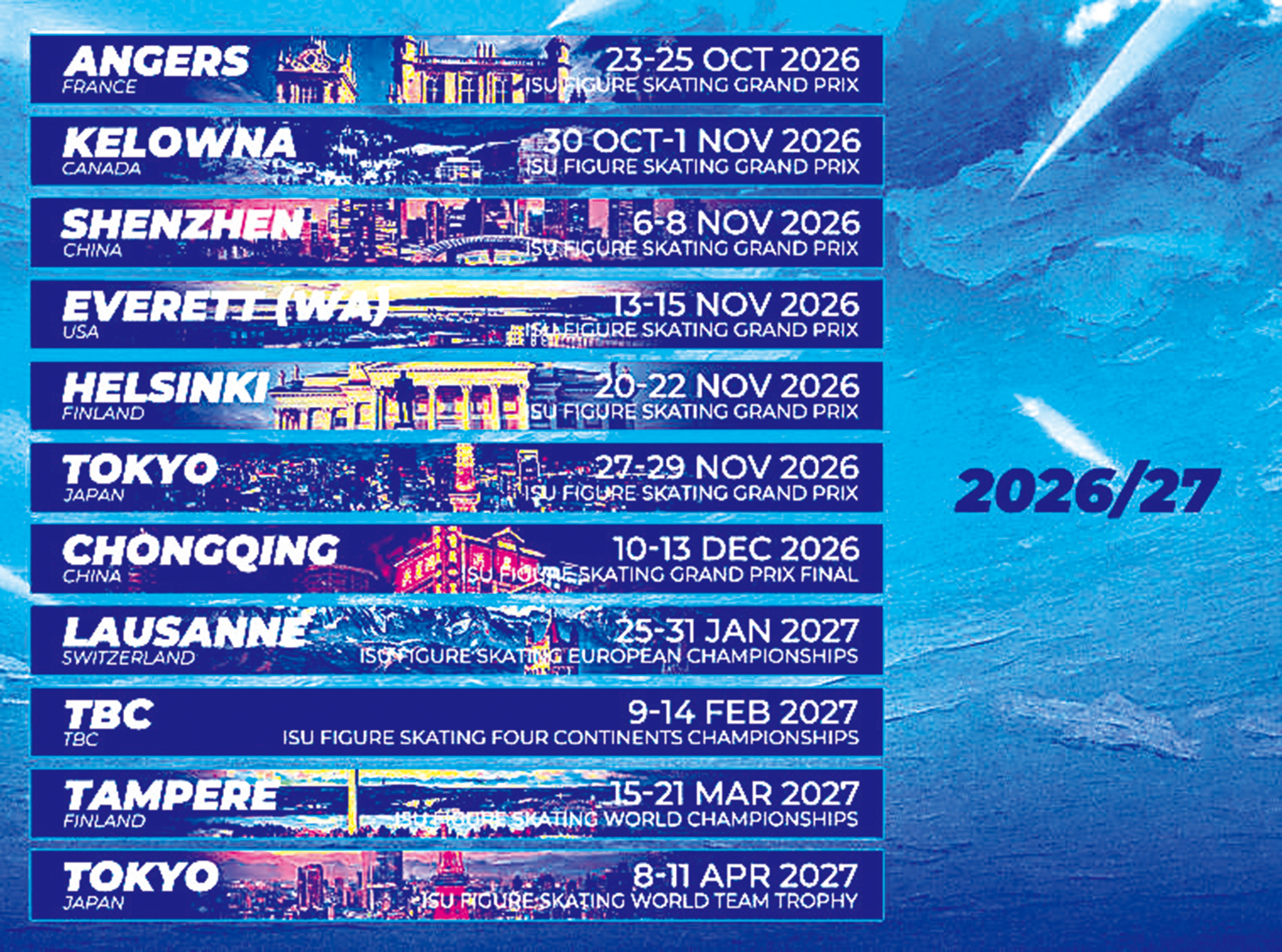 花樣滑冰方面,國際滑聯大獎賽本賽季將於10月底在法國拉開帷幕,共有7站比賽,其中兩站在中國舉行,分別在深圳和重慶,其中12月10日至13日的成年組和青年組的總決賽都將在重慶舉行。