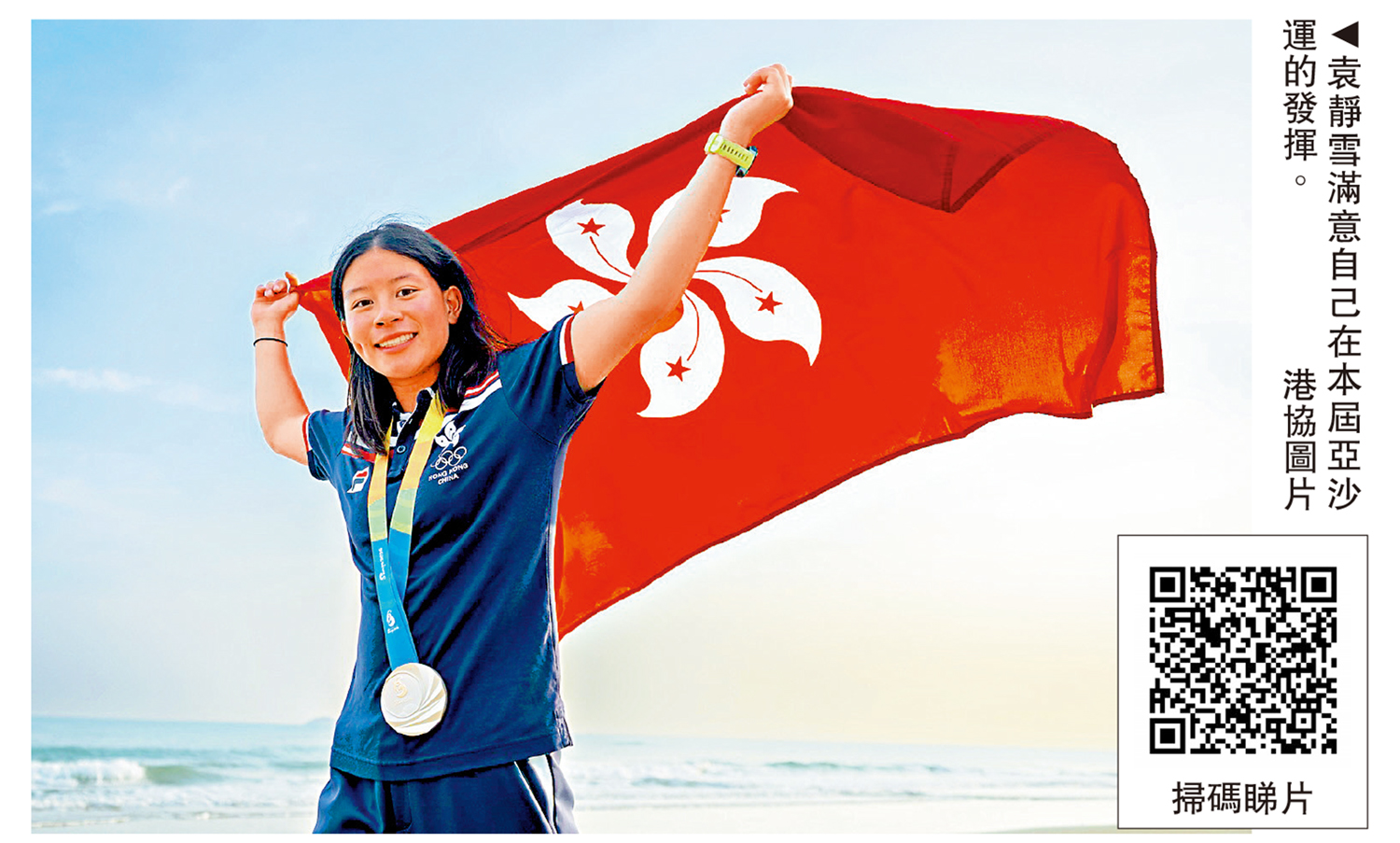 【大公報訊】記者朱家立報道:中國香港代表團在第6屆亞洲沙灘運動會增添獎牌。港隊健兒袁靜雪在滑浪風帆水翼帆板公開系列賽女子組摘得銀牌,港隊在本屆賽事暫獲2銀1銅。袁靜雪賽後表示,對自己整體發揮感到滿意,期望在下周的亞運會選拔賽上力爭佳績。