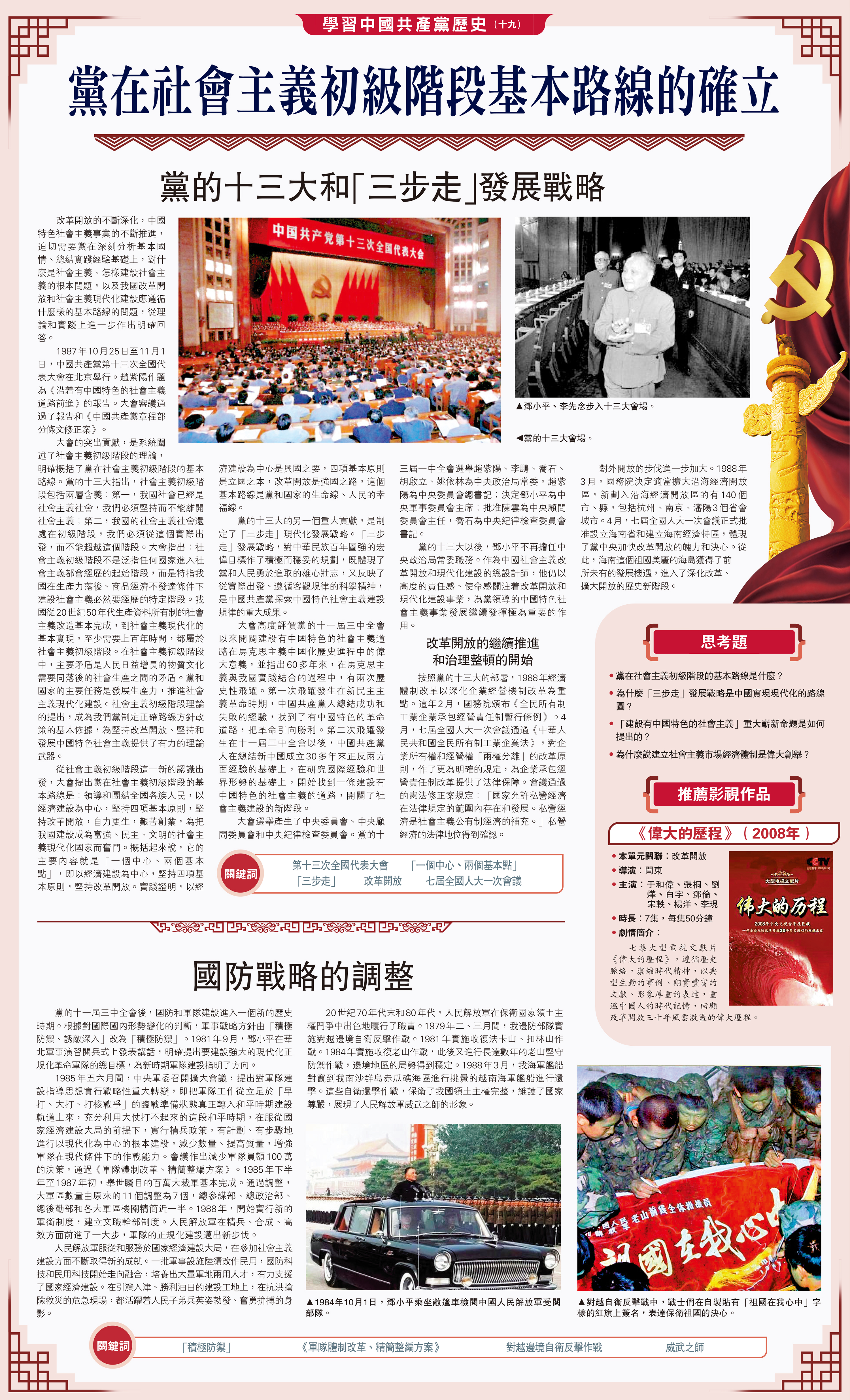 黨的十三大的另一個重大貢獻,是制定了「三步走」現代化發展戰略。「三步走」發展戰略,對中華民族百年圖強的宏偉目標作了積極而穩妥的規劃,既體現了黨和人民勇於進取的雄心壯志,又反映了從實際出發、遵循客觀規律的科學精神,是中國共產黨探索中國特色社會主義建設規律的重大成果。