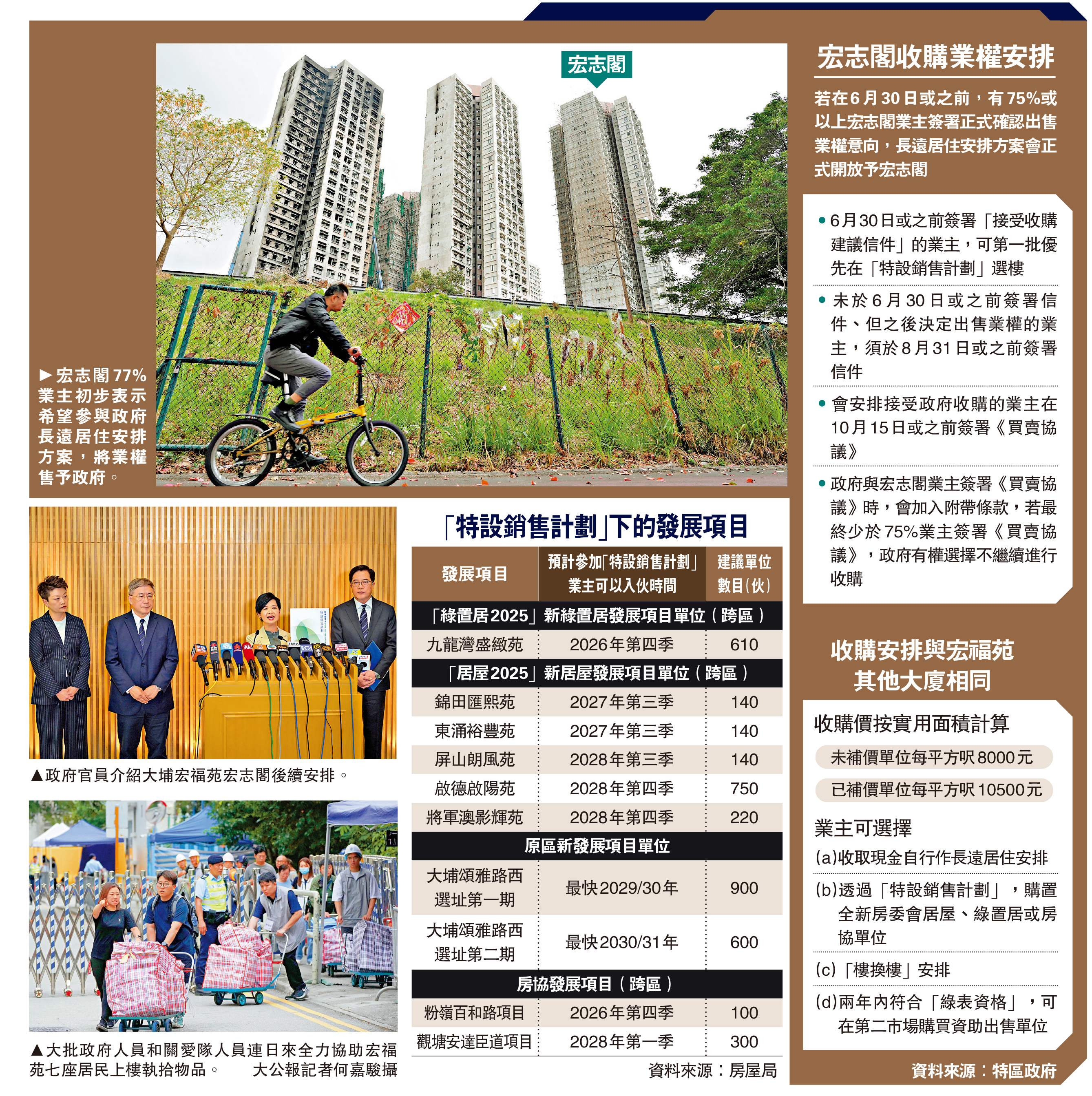 政府2月公布宏福苑長遠居住安排,收購業權方案並不包括未受火災波及的宏志閣。事隔兩個月,房屋局解說專隊已接觸99%宏志閣業主,當中約77%初步表示希望參與政府長遠居住安排方案,將業權售予政府。因應宏志閣業主對加入長遠居住安排方案的意見有高度共識,政府昨日宣布,在6月30日或之前,若有不少於四分之三、即75%的宏志閣業主簽署「接受收購建議信件」,確認將其業權售予政府,現時適用於宏福苑A至G座的長遠居住安排方案,將開放予宏志閣業主。