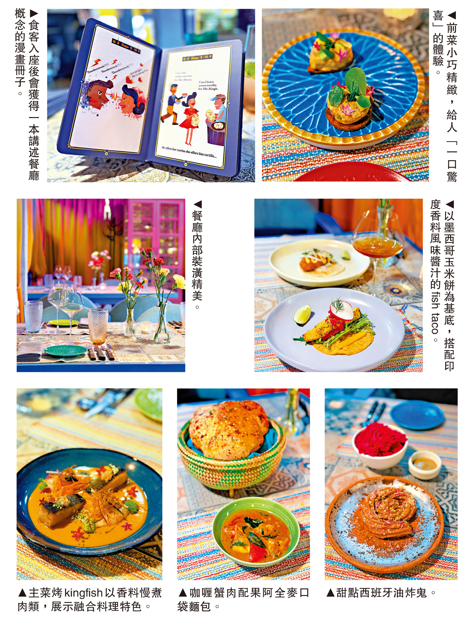 有趣的是,餐廳在用餐體驗的開端就埋下伏筆:食客入座後,會先獲得一本設計可愛的漫畫冊子,透過生動的畫面講述瑪利亞與辛格相識、相戀的故事,並自然引出餐廳的創意來源。