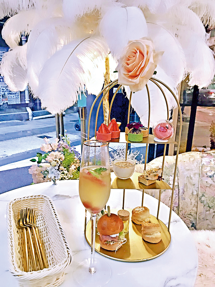 嘆下午茶少不了飲品,該店的飲品都注重顏色和味道的搭配,還有細緻的擺盤。我點的荔枝梳打消暑解渴,玻璃杯旁放了紫色繡球花作陪襯;整壺洛神花茶是瑰麗的玫紅色,茶具盛在木製托盤上有一大朵暗紅玫瑰為伴;還有玫瑰鮮奶咖啡,粉紅色的杯中是香氣四溢的Latte,上有令人會心微笑的心形拉花,一切都美輪美奐,目不暇給。捧着色彩繽紛的花茶、在羽毛裝飾燈前微笑、於甜點塔前合照,都是友情美好的回憶。店員沒有催促顧客離開,大家都放慢腳步享用美食、聊天。
