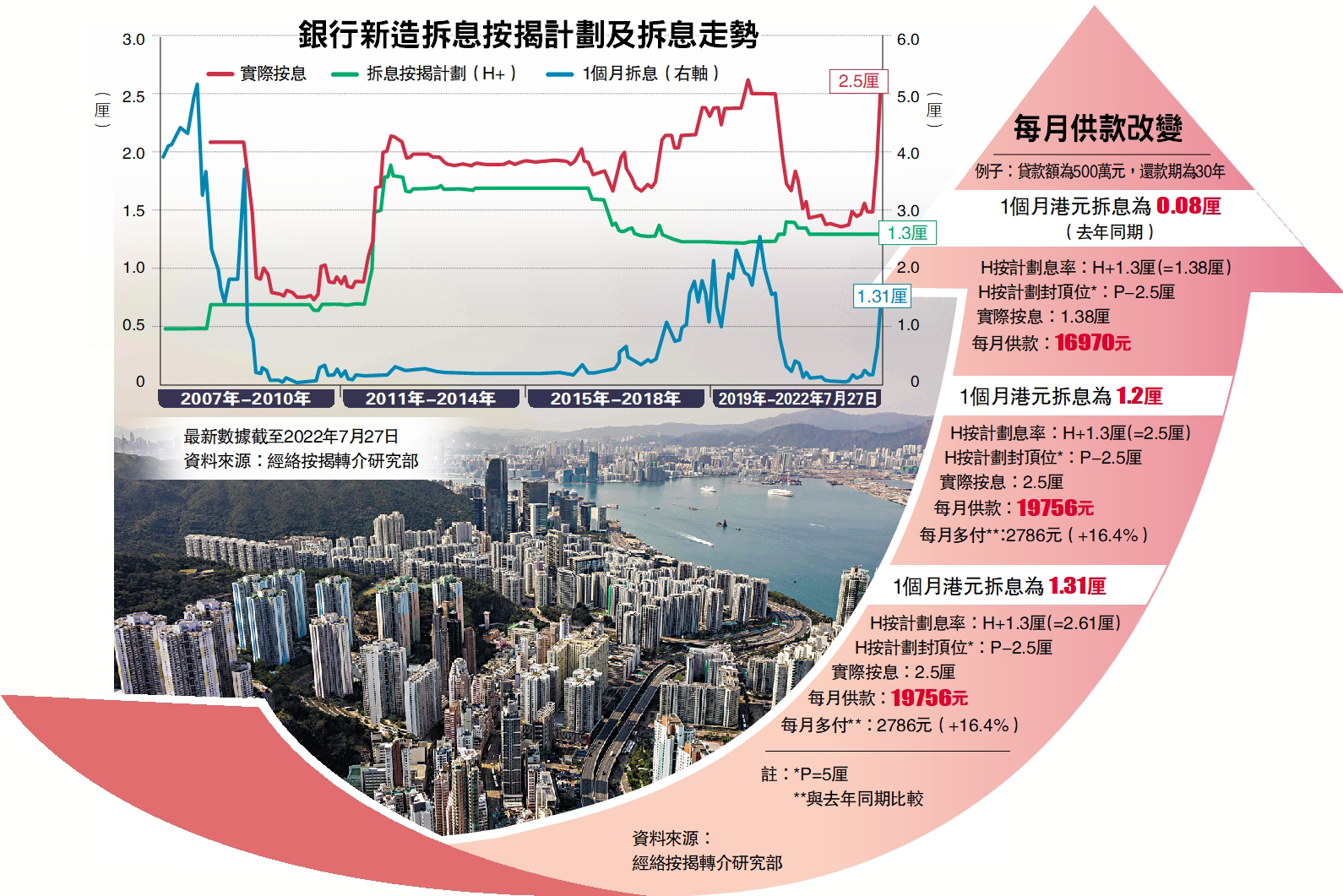 經絡按揭轉介首席副總裁曹德明表示,1個月拆息已升穿1.2厘(即H按封頂位),達到1.31厘;以貸款額500萬元,還款期為30年為例,實際息率仍維持在2.5厘水平,每月供款為19756元,雖然相比一年前,1個月拆息為0.08厘,實際息率為1.38厘,每月供款增加2786元或16.4%,但供款已沒有進一步增加。他又指,H按的封頂息率有助保障及鎖定客戶的供樓利息開支,除非P上升,否則拆息即使繼續上升,客戶仍只需以封頂息率作供款,因此相信H按仍為主流按揭計劃。