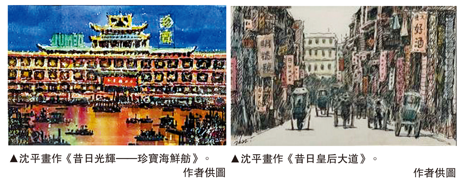 香港昔日是漁港,今日是國際知名的港海都市,維港景色深具魅力。展覽中多幀畫作以維港為題,既有艷陽夕照維港風光、灣仔會展、銅鑼灣舟艇簇泊的場景,也有紅帆駛過的夜景,古今情韻交織。昔日大都消逝,但在大澳水鄉,漁民仍生活作息在臨水而建的棚屋、船艇之上,在其中晾衣、曬魚及海產。棚屋曾一度為火災燒毀,後部分重建,至今已成為具有本土風情的旅遊景點。這些畫作呈視對原住民純樸生活情懷的體會。香港有不少古蹟舊區,盛載着集體回憶,昔日保育意識不強,有不少已遭拆卸,成為憾事,沈平對這些舊區、古建也獨有情懷,他從歷史圖片中發掘,藉着畫筆和想像將其活化紙上。多幀描繪舊日中上環街景的鋼筆素描,光線陰陽對比強烈,線條勾勒繁密,構圖層次深度遠近得法。他以攝影角度重現華洋店舖林立,人力車、汽車、挑擔販子穿梭活動其間,將過往市中心熙來攘往場景活現。原為醫館、武館、學校的灣仔藍屋;在舊區街道上偶見的舊樓商舖,這些已逝或倖存的歷史,均成為畫家心中昔今交錯的想像。