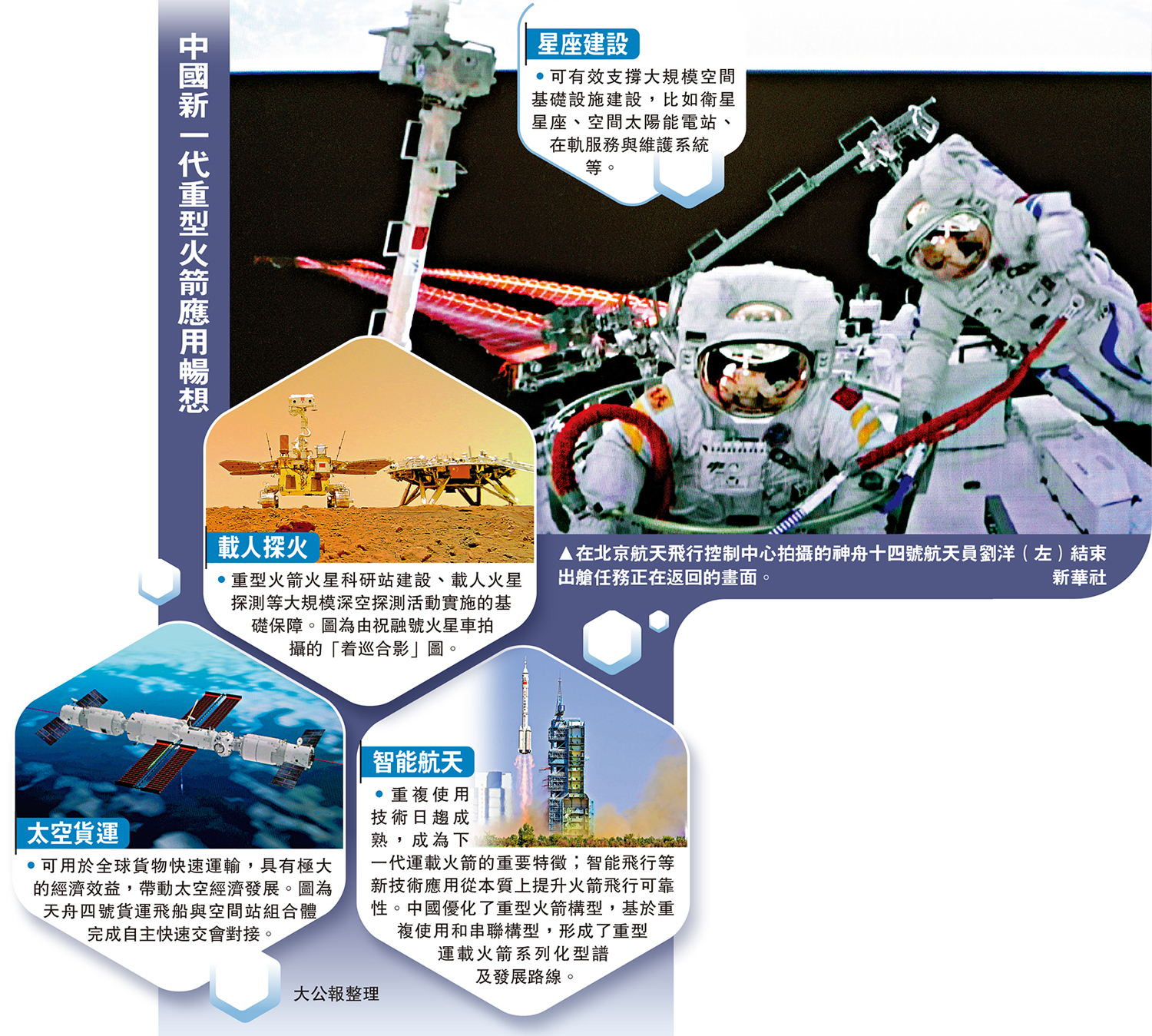 1月18日,中國航天科技集團舉辦《中國航天科技活動藍皮書(2022)》發布會,明確了2023年中國航天將開展的一系列重大任務。中國航天科技集團一院總體設計部總體室副主任顧名坤18日透露,中國未來將攻克二子級軌道再入重複使用關鍵技術,研製具備完全重複使用能力的重型運載火箭,使航天運輸更具經濟效益。未來,重型火箭可應用於月球資源開發利用,以及載人火星探測等大規模深空探測活動。\大公報記者 劉凝哲北京報道