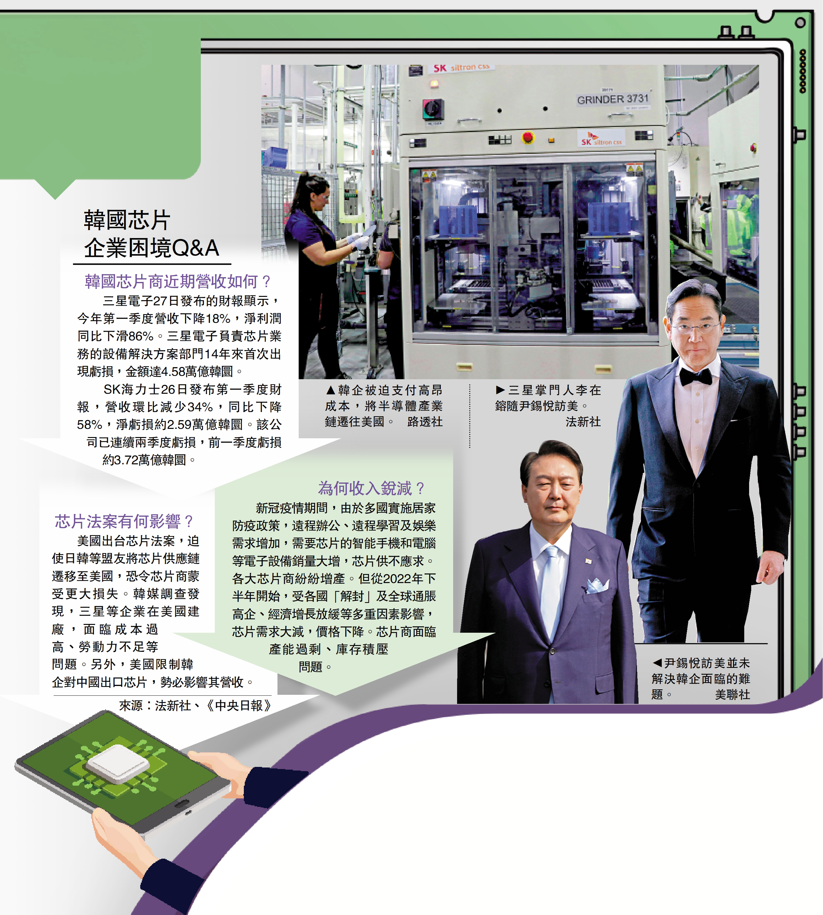 【大公報訊】綜合《中央日報》、路透社、法新社報道:韓國總統尹錫悅訪美大談韓美同盟之際,三星電子、SK海力士兩大韓國芯片商業績卻出現慘烈下跌。受全球經濟增速放緩、芯片需求減少影響,韓國半導體行業本就深陷困境;美國推出芯片法案,脅迫韓國等盟友與中國「脫鈎斷鏈」,進一步擾亂全球半導體供應鏈,令韓企損失慘重。有評論稱,這是美方「搬起石頭,砸了盟友的腳」。