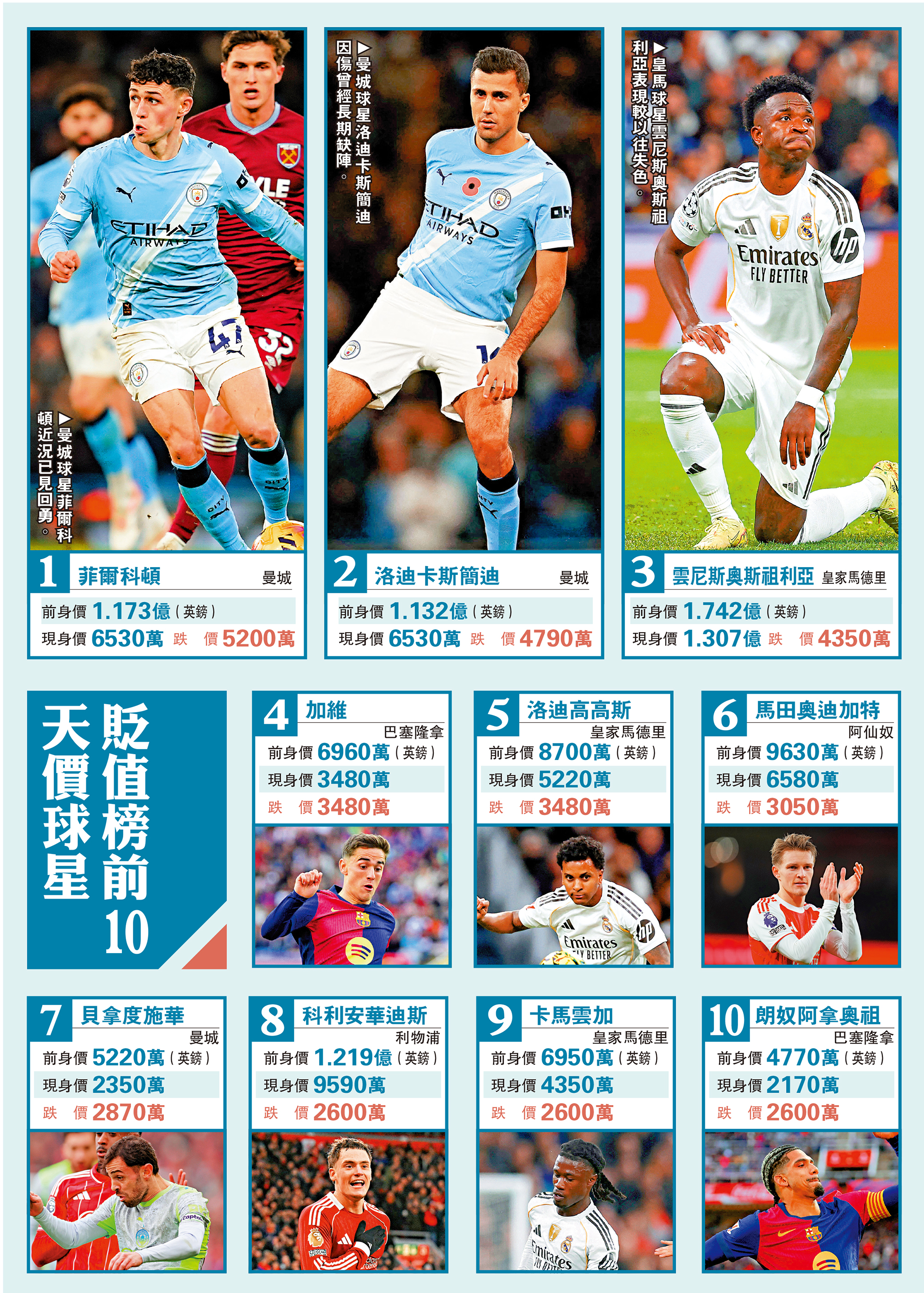 隨着天價球星表現不似預期,英國媒體披露全球十大貶值球星名單,英超勁旅曼城首當其衝竟然「包辦冠亞」,表現欠佳的中場菲爾科頓及長期養傷的防中洛迪卡斯簡迪分佔貶值榜榜首和榜眼,反而被嘲「天價水貨」的利物浦中場華迪斯只位列第8位,或許他年輕具潛質有更大回勇空間。其他入榜的還包括前世界足球先生雲尼斯奧斯祖利亞,及他的皇馬隊友洛迪高高斯與卡馬雲加,曼城的貝拿度施華等,10大球星身價便蒸發近3.5億英鎊。\大公報記者 梁潤森