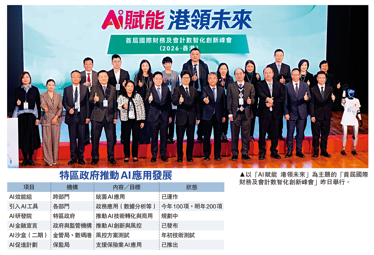 全球會計行業被人工智能、區塊鏈、雲計算等前沿技術重構。以「AI賦能 港領未來」為主題的「首屆國際財務及會計數智化創新峰會(2026·香港)」昨日舉辦,匯聚財金界領袖、學術權威等近300位精英。